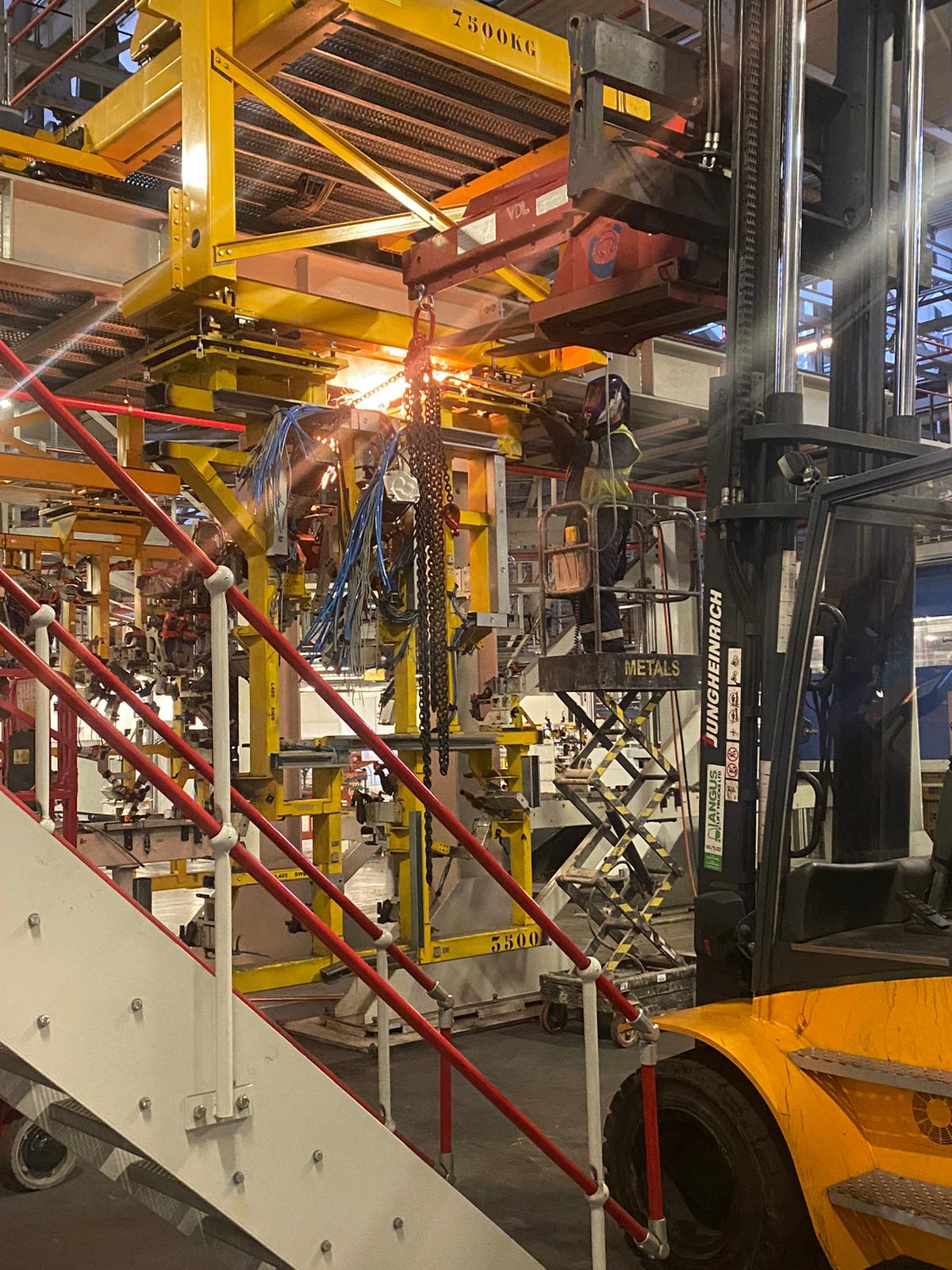 The gantry had numerous large and intricate lifts which were more than 6 meters high and tight to the building’s roof. Then flanked on all sides with other live manned workstations, which could not be affected by our works and risk down time for the factory / other production lines. Due to the building being live and having extremely restricted / cramped areas, all works had to be planned to the highest standards, communicated to the other parties involved with the works on a daily basis as works progressed, then executed in military precision.